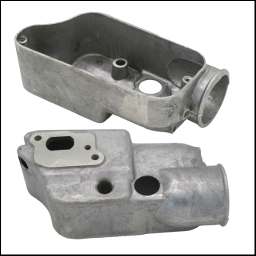 Peças metálicas fundidas cinzentas com várias aberturas, sobre fundo branco