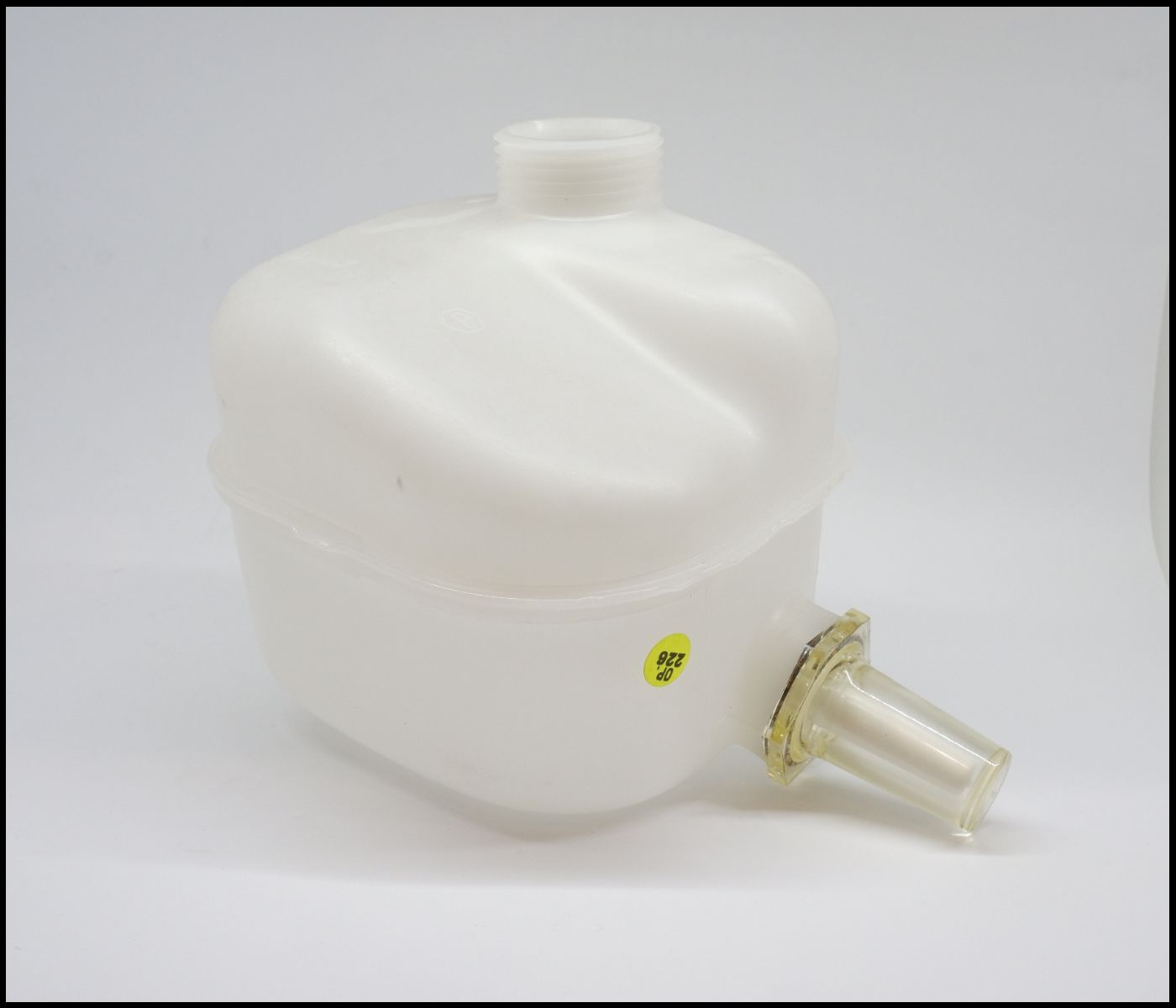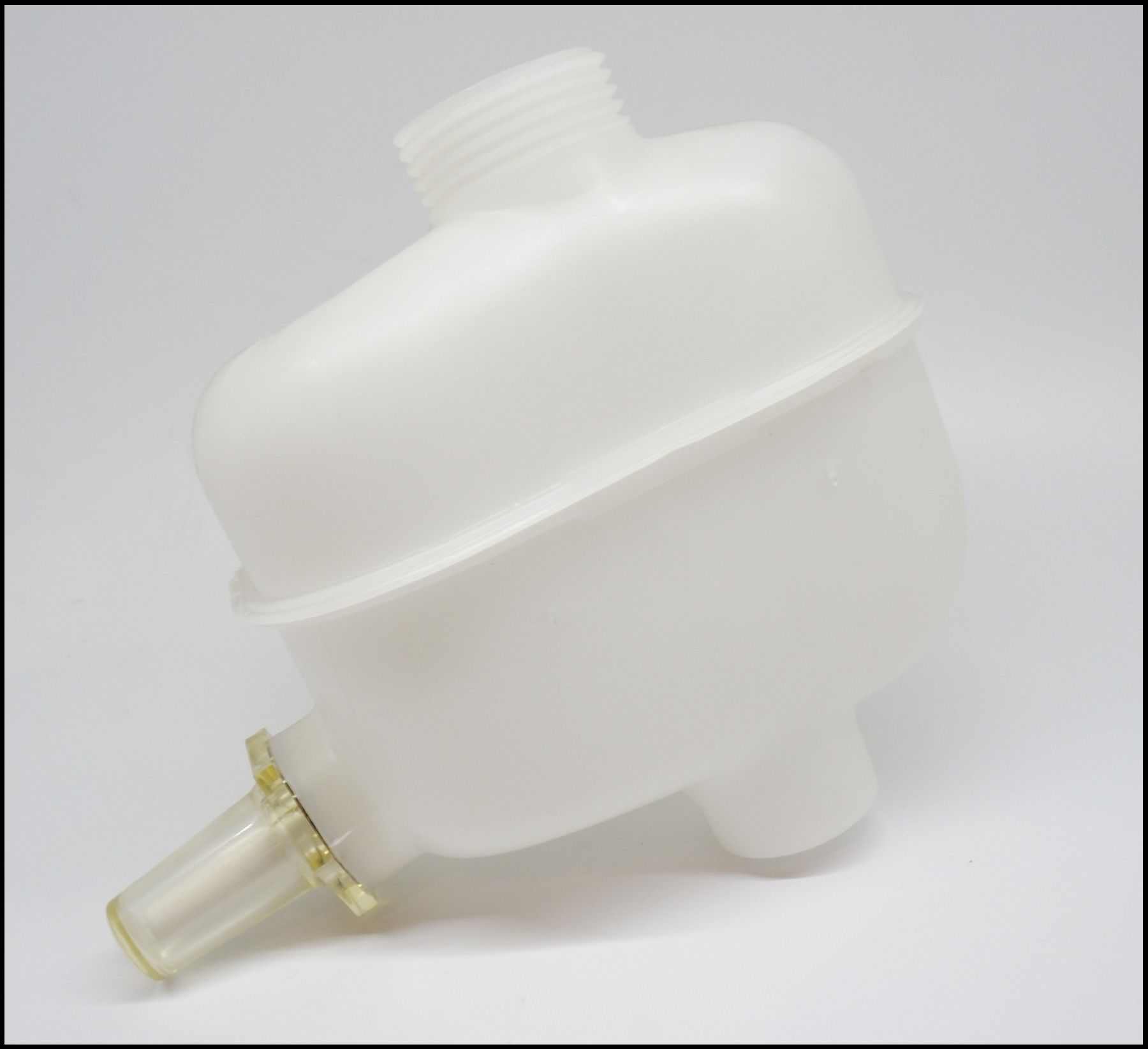 Recipiente plástico branco opaco com saída lateral transparente amarelada