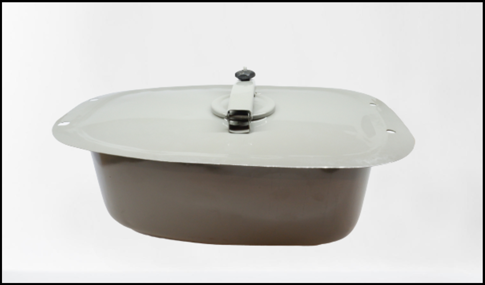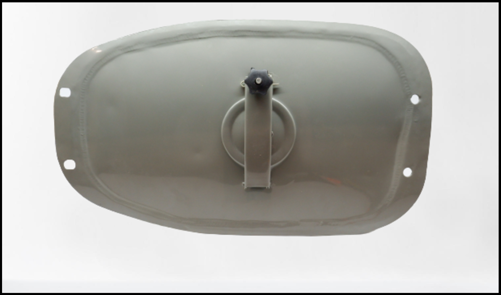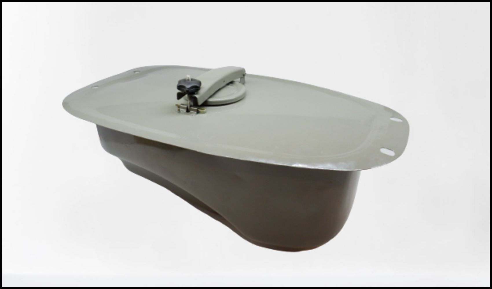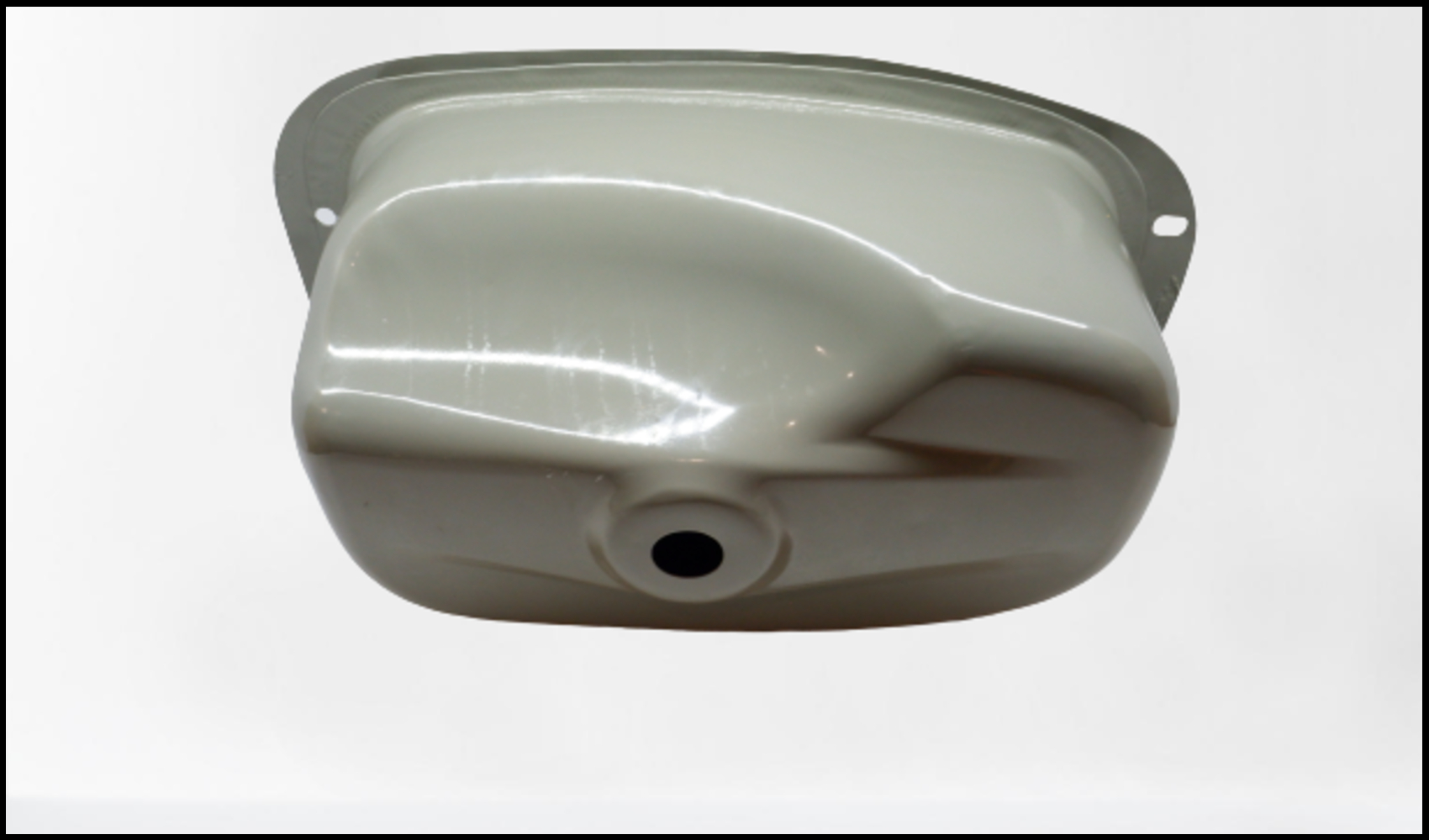 Tanque metálico cinza claro com orifício central e abas laterais para fixação