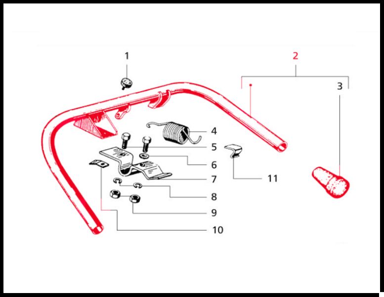 Diagrama técnico de peças metálicas vermelhas e cinzentas numeradas