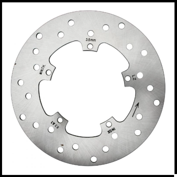 Disco de travão metálico circular prateado com furos e marcas pretas