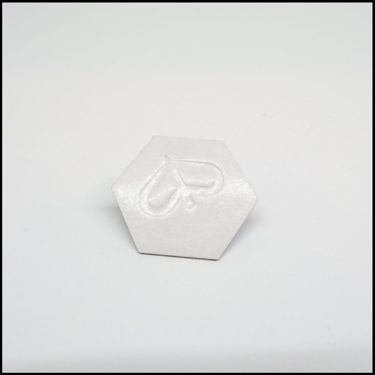 Peça hexagonal branca com símbolo em relevo de gota e letra P