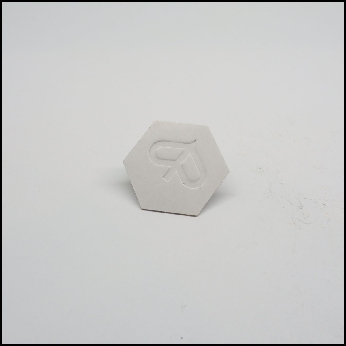 Objeto hexagonal branco com relevo em forma de R
