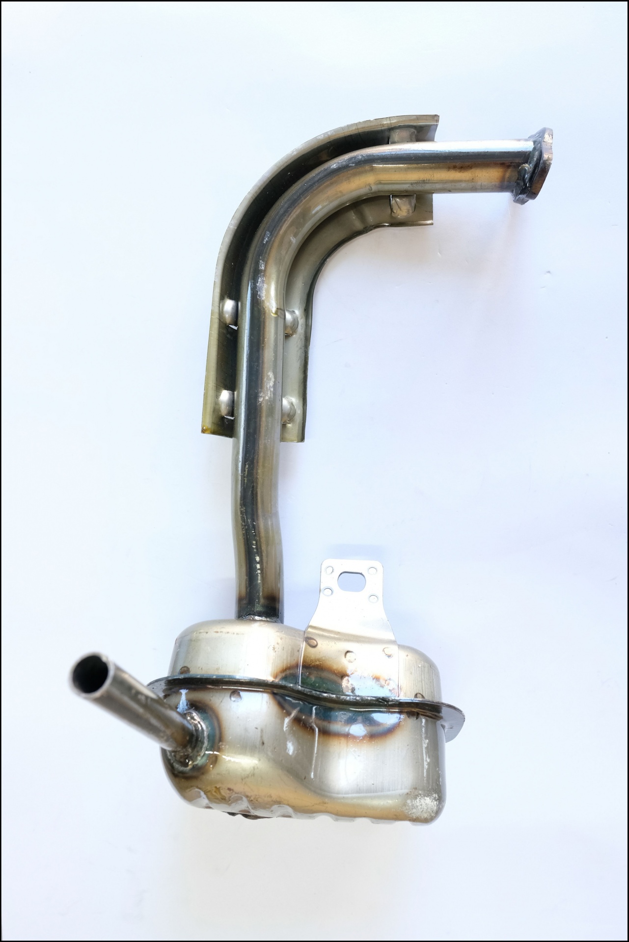 Peça metálica de escape automóvel com tubo curvo e caixa retangular