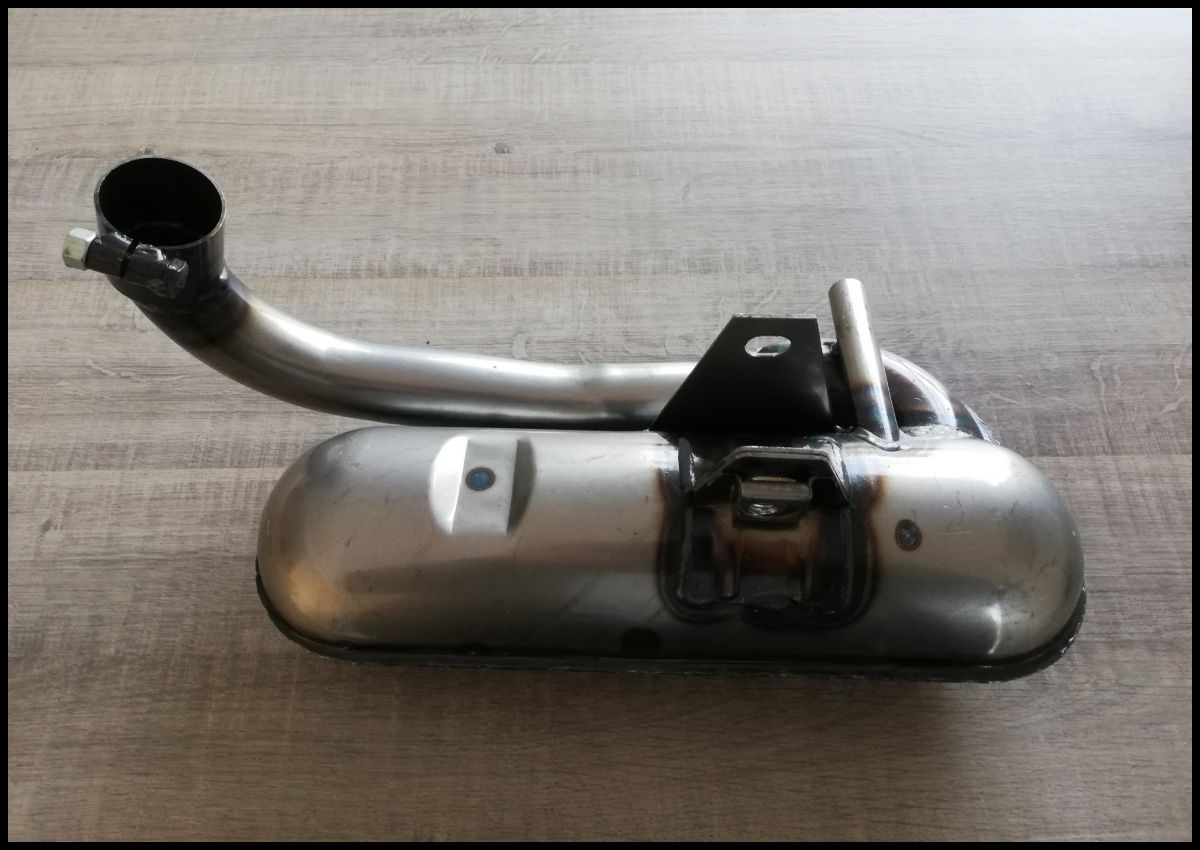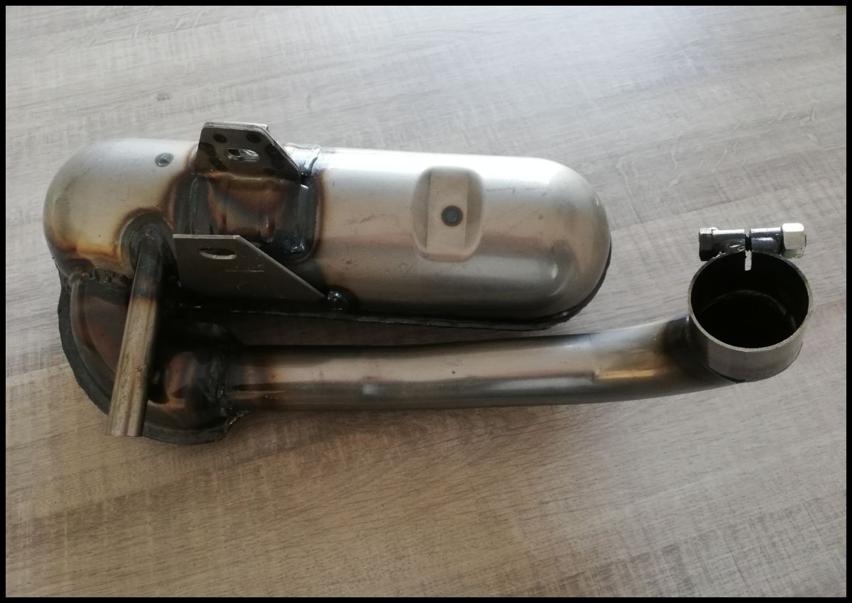 Escapamento automóvel em metal prateado com tubo curvo e suporte preto sobre mesa de madeira clara