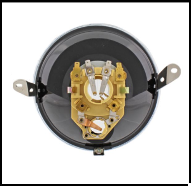 Farol redondo automóvel com suporte amarelo e conectores elétricos