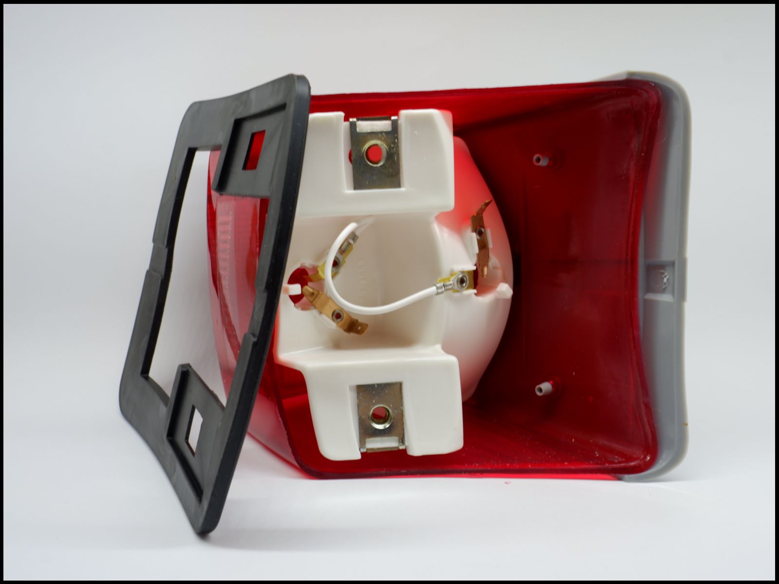 Luz traseira automóvel vermelha com estrutura branca e moldura preta