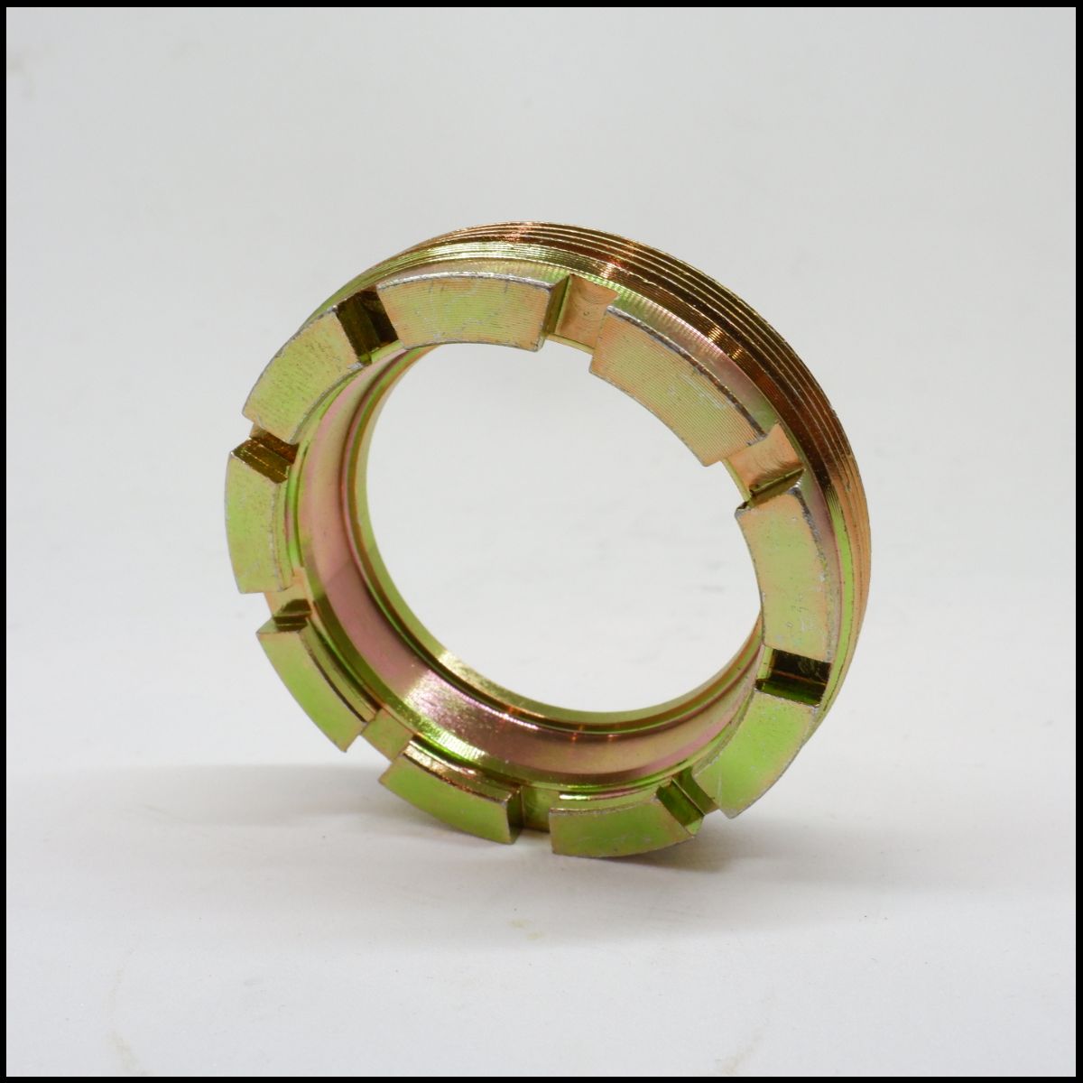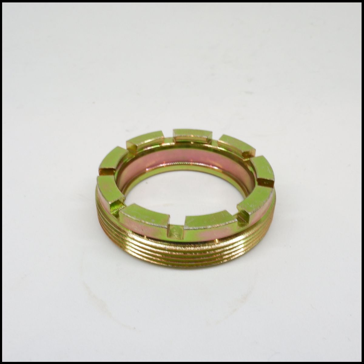 Anel metálico dourado com rosca e ranhuras sobre superfície branca