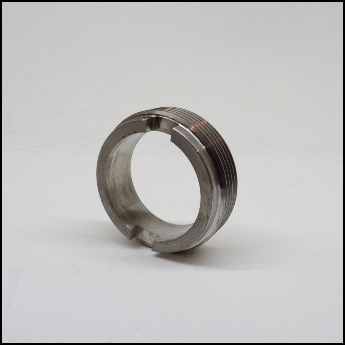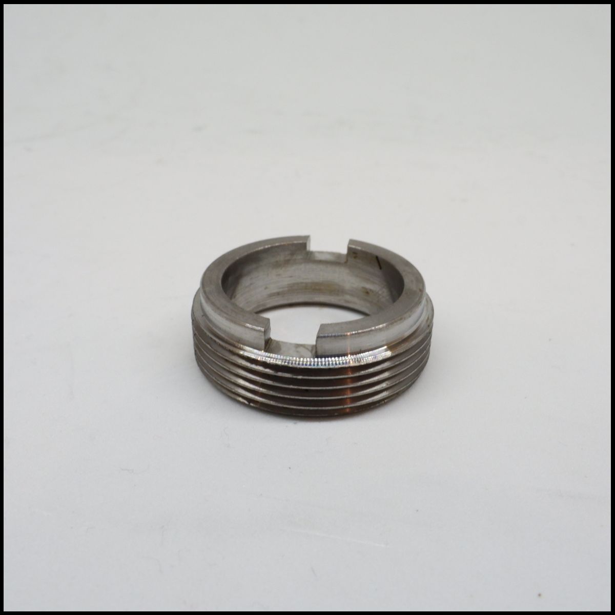 Anel metálico prateado com roscas e entalhes sobre superfície branca