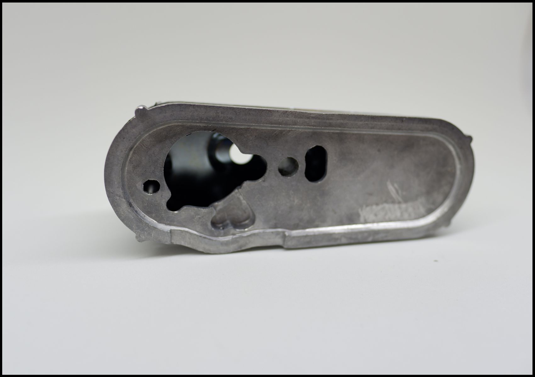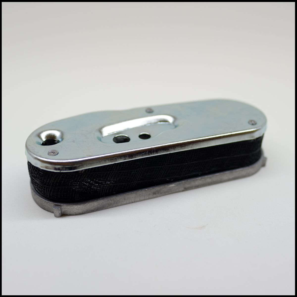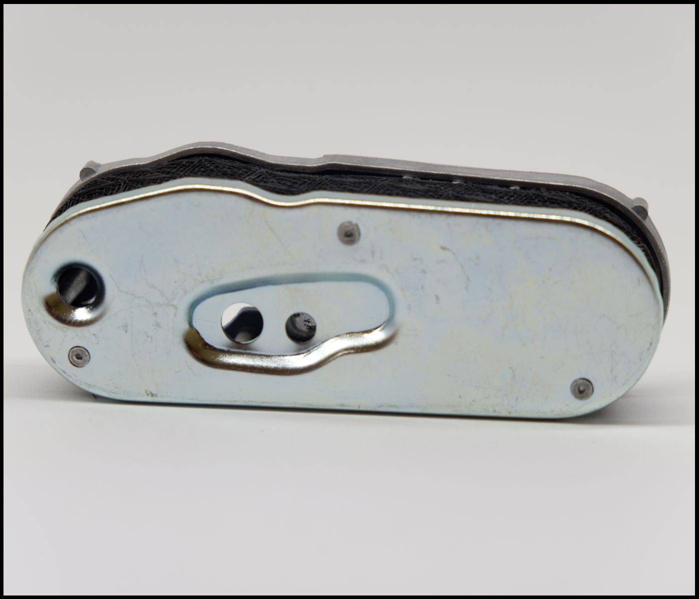 Aparelho metálico prateado com orifícios e parafusos sobre superfície branca