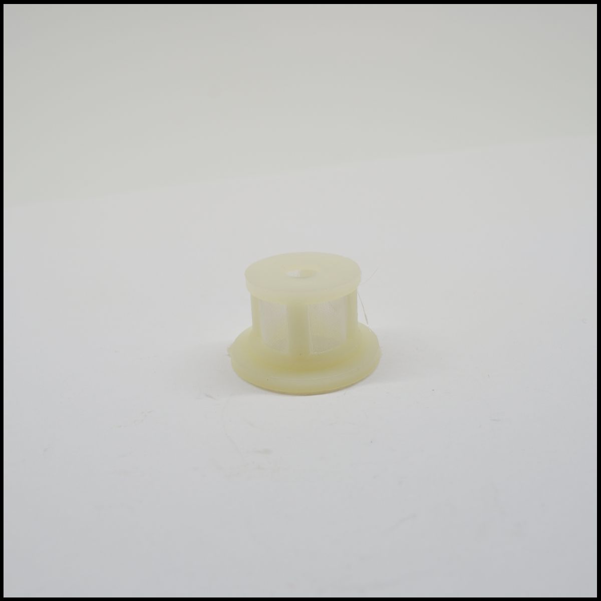 Pequeno acessório cilíndrico de plástico branco sobre superfície branca