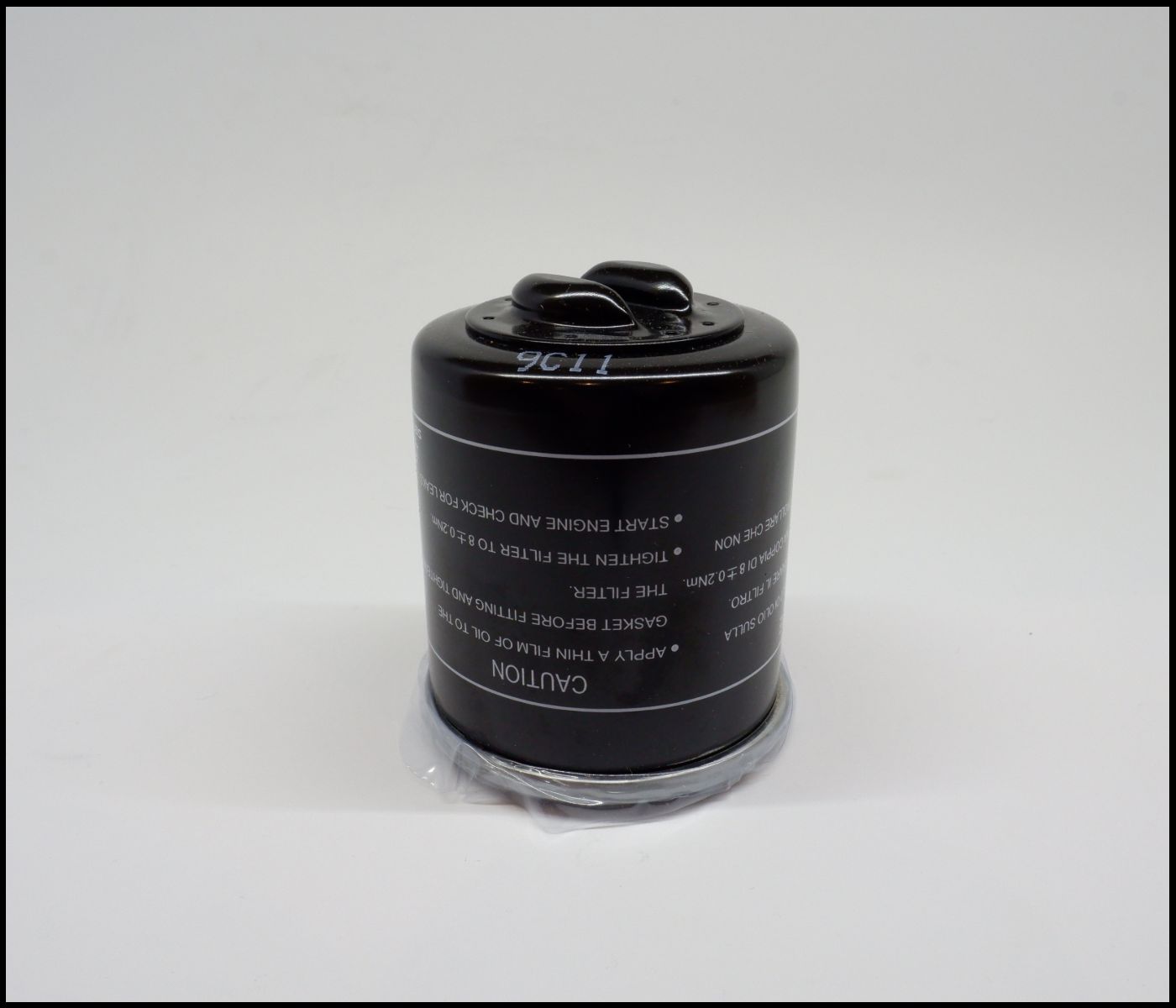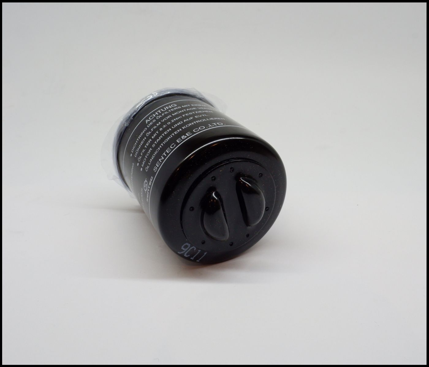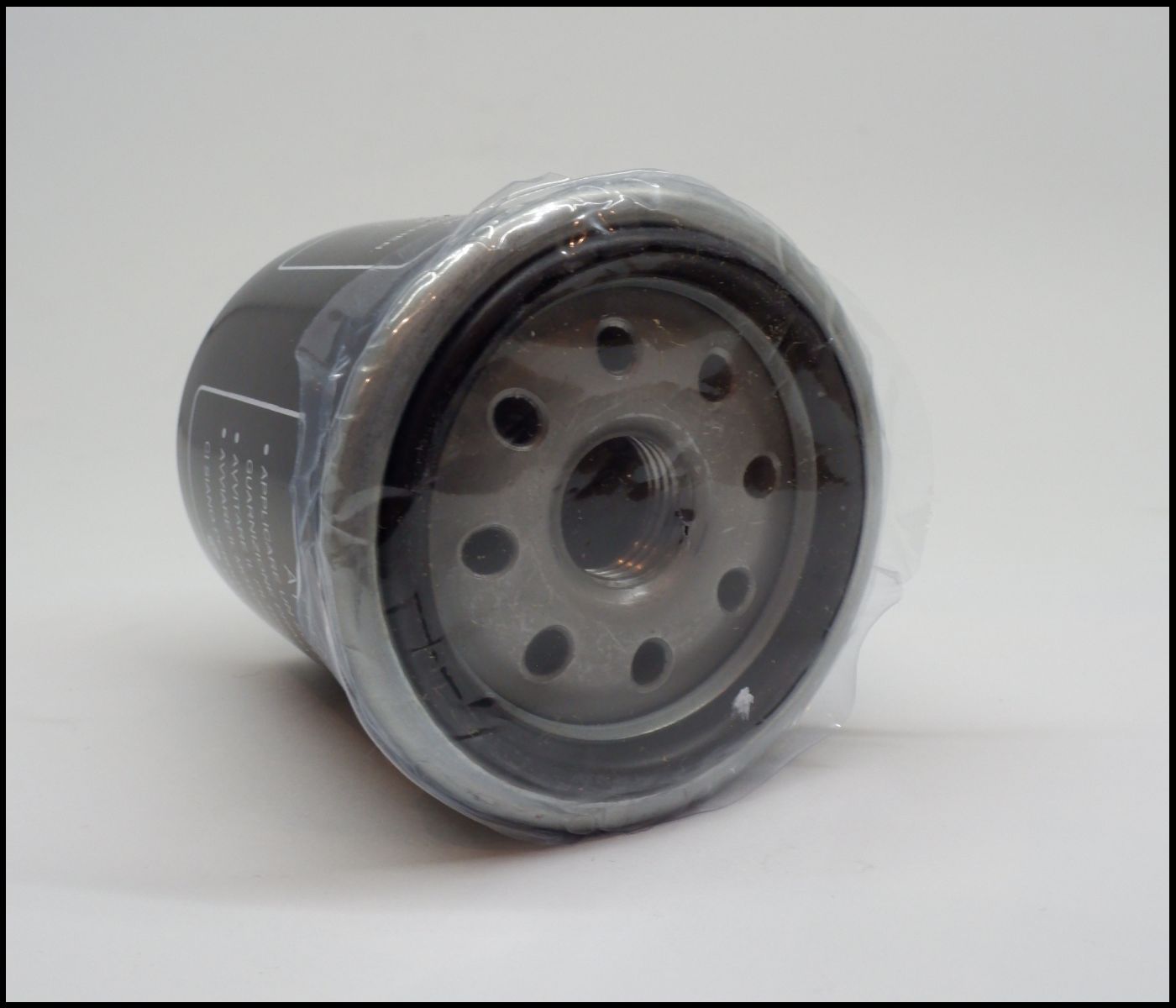 Filtro de óleo preto com tampa metálica prateada perfurada e embrulhado em plástico transparente