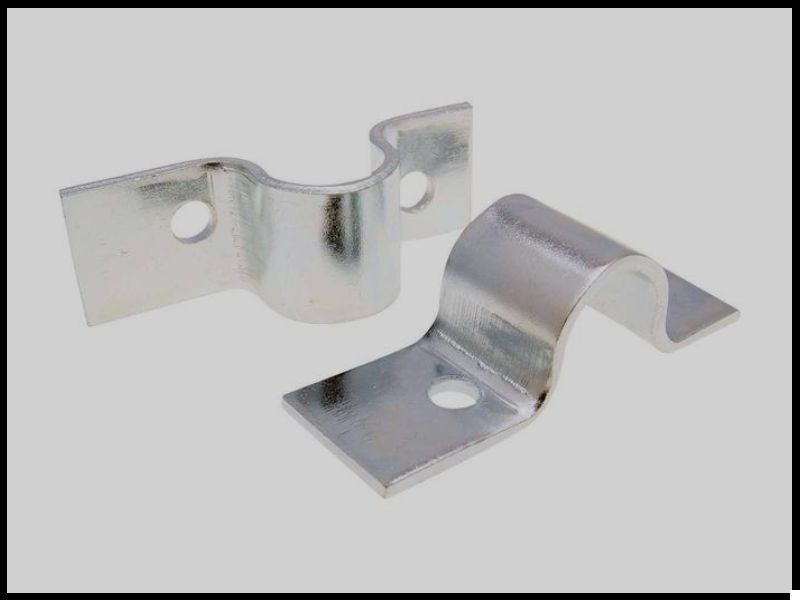 Dois suportes metálicos prateados com orifícios para fixação