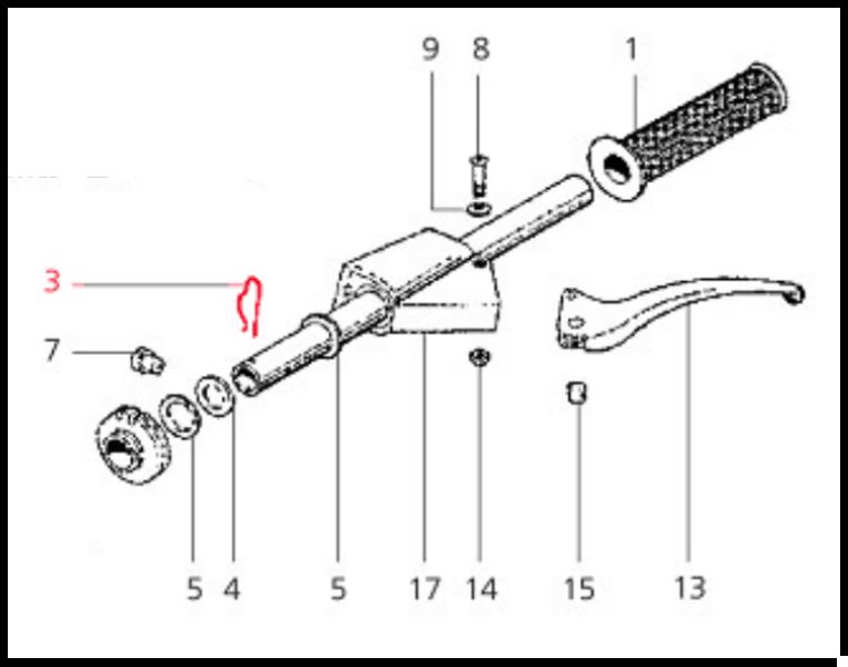 Diagrama técnico de peças de um punho de bicicleta ou mota com várias peças numeradas.