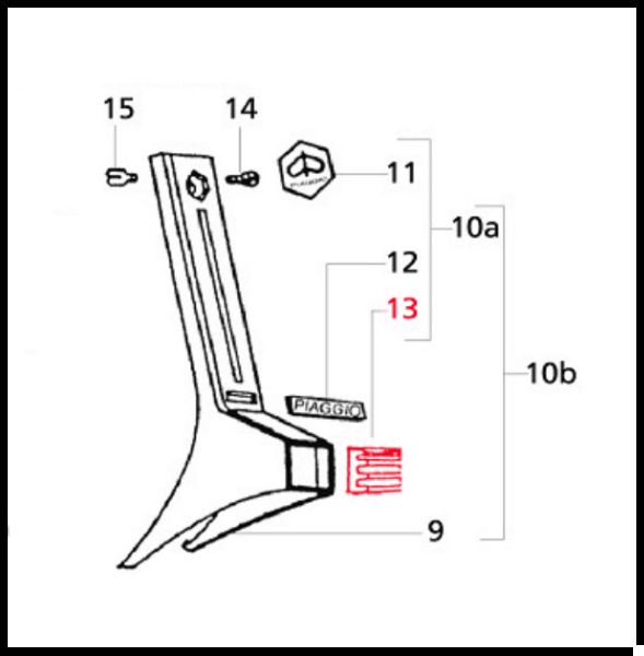 Desenho esquemático de peça metálica com etiquetas numéricas e palavra PIAGGIO