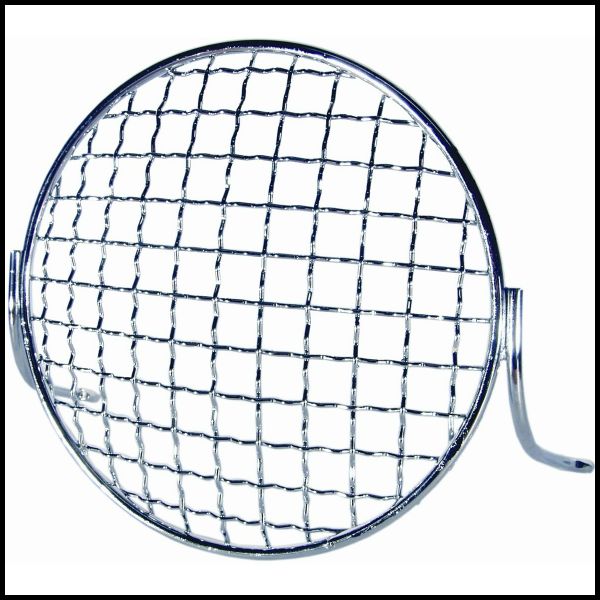 Grade metálica circular com padrão quadriculado e suporte lateral