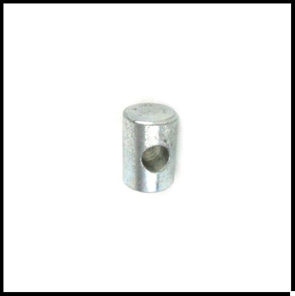 Peça metálica cilíndrica prateada com furo lateral sobre fundo branco