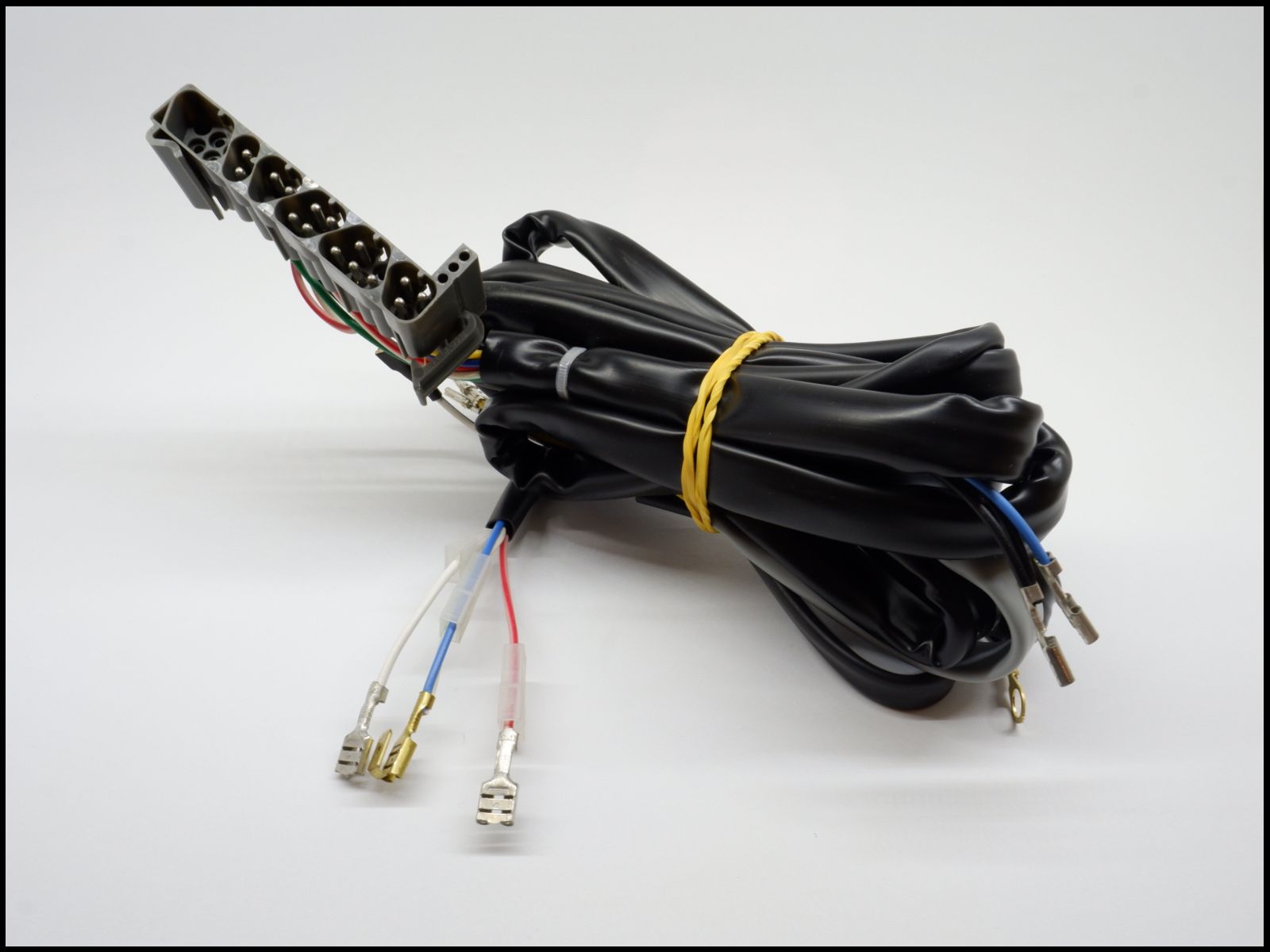 Cabo preto com conectores múltiplos metálicos e fios coloridos