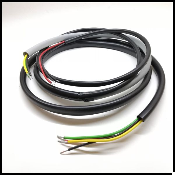 Cabo elétrico cinza com três fios coloridos expostos e terminados em pontas metálicas