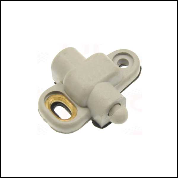 Peça de plástico cinzenta com orifícios metálicos dourados para fixação