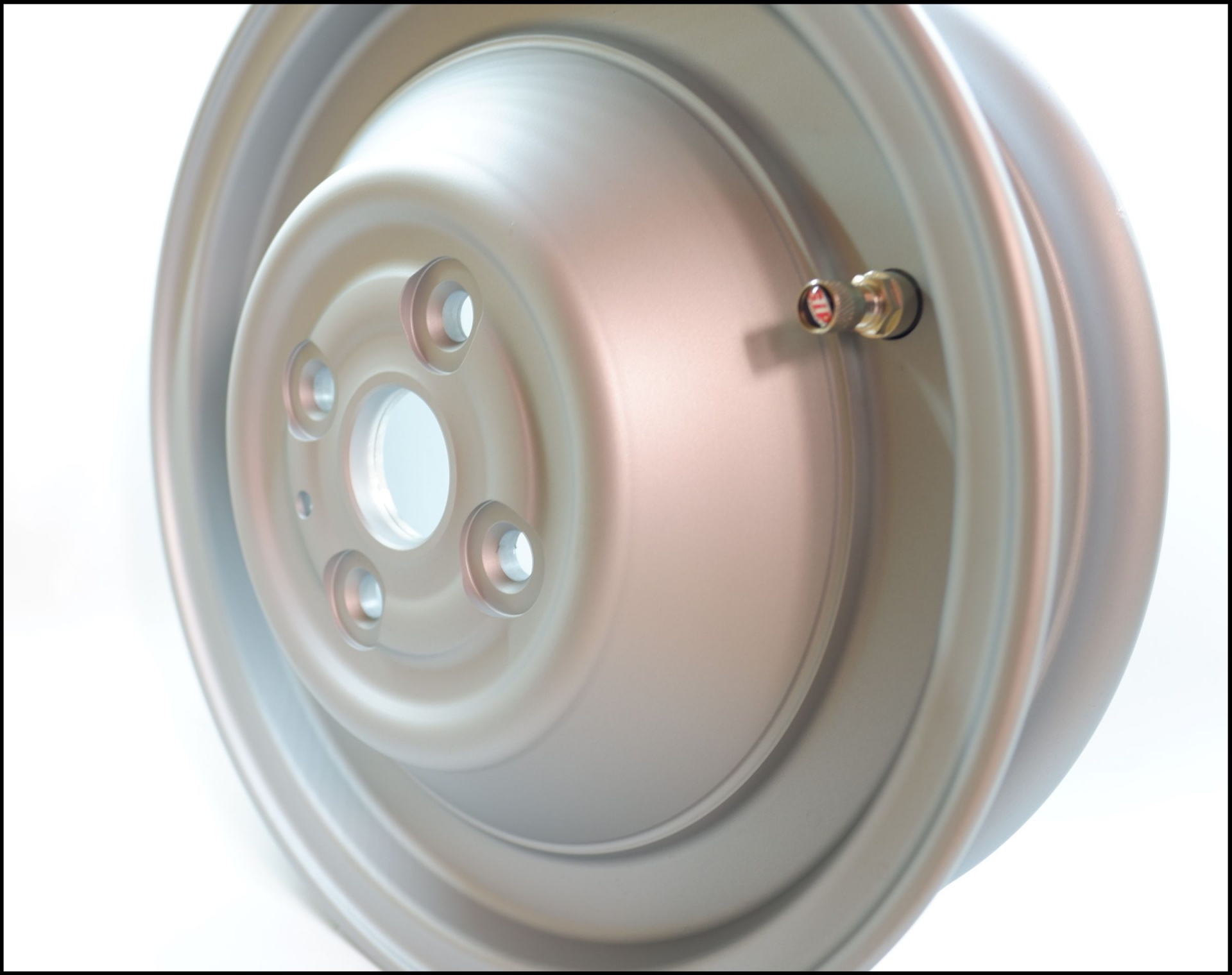 Roda metálica cinza claro com cinco orifícios e válvula de ar