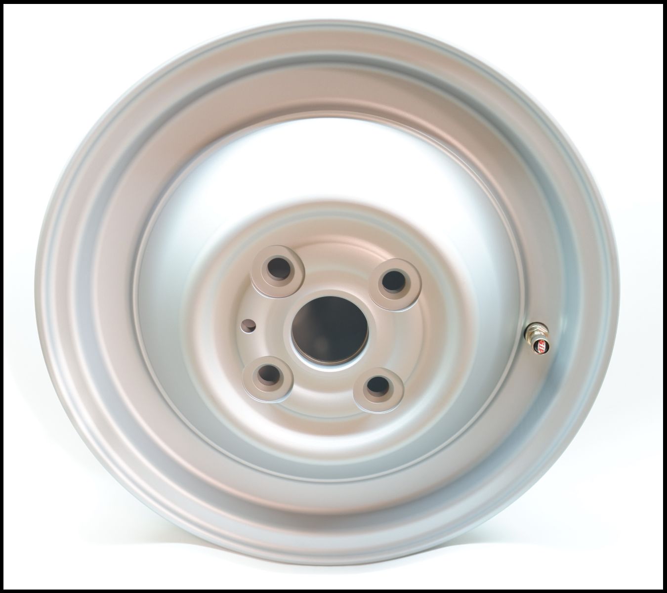 Jante metálica cinza prateada com cinco orifícios para parafusos e válvula de ar