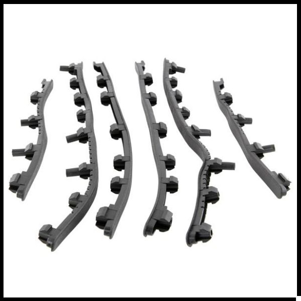 Peças plásticas curvas pretas com saliências cilíndricas sobre fundo branco