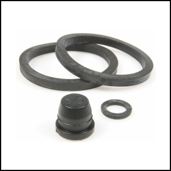Peças de borracha circulares e tampão preto sobre fundo branco