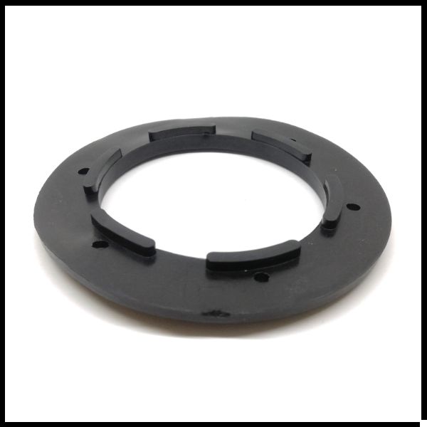 Peça circular plástica preta com fendas e orifícios