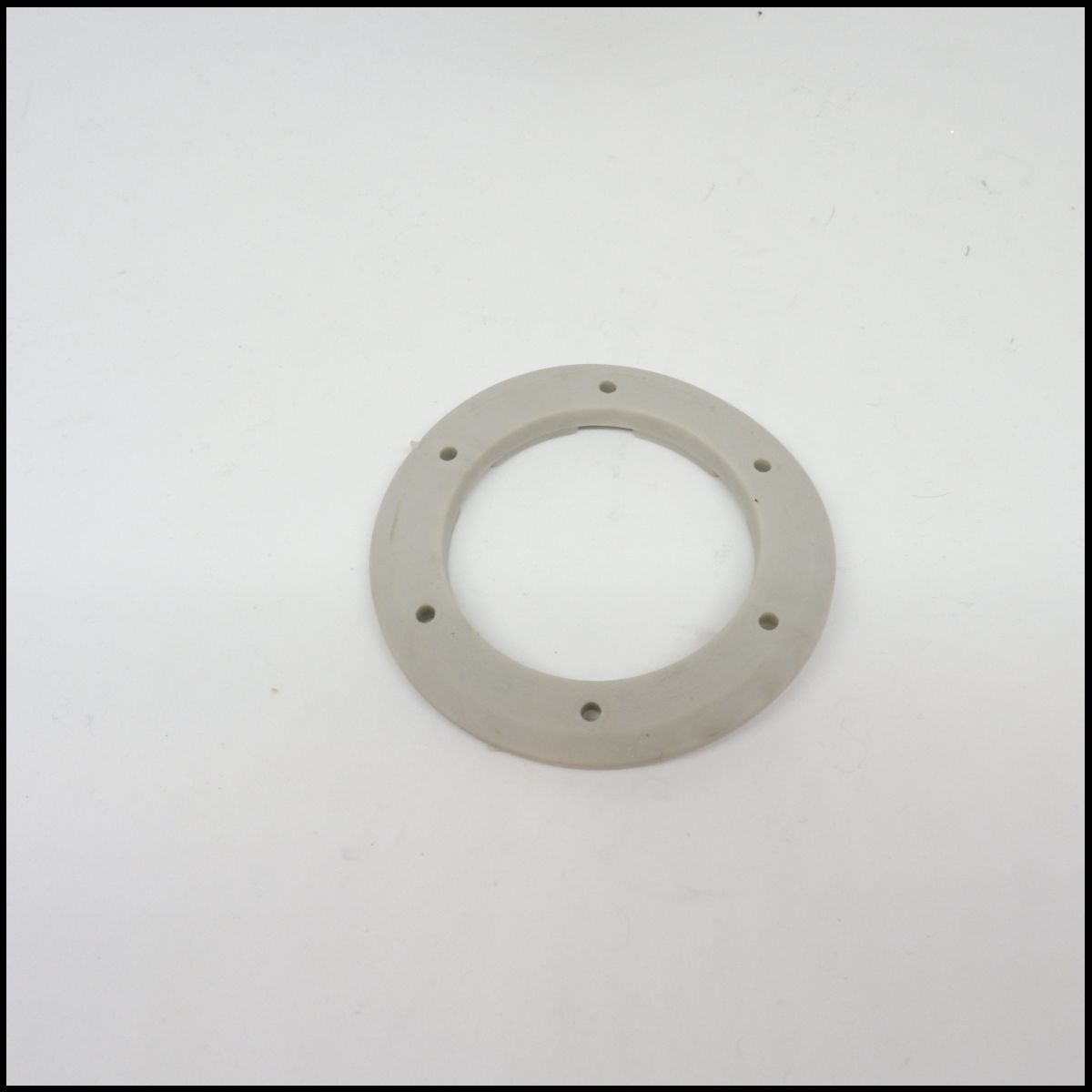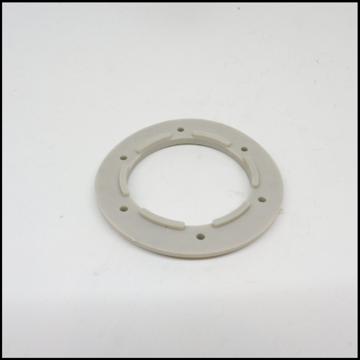 Anel plástico cinzento claro com orifícios e saliências em fundo branco