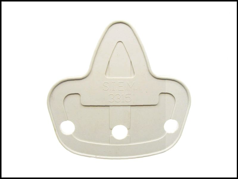 Peça plástica branca com três furos e inscrições SIEV 3315