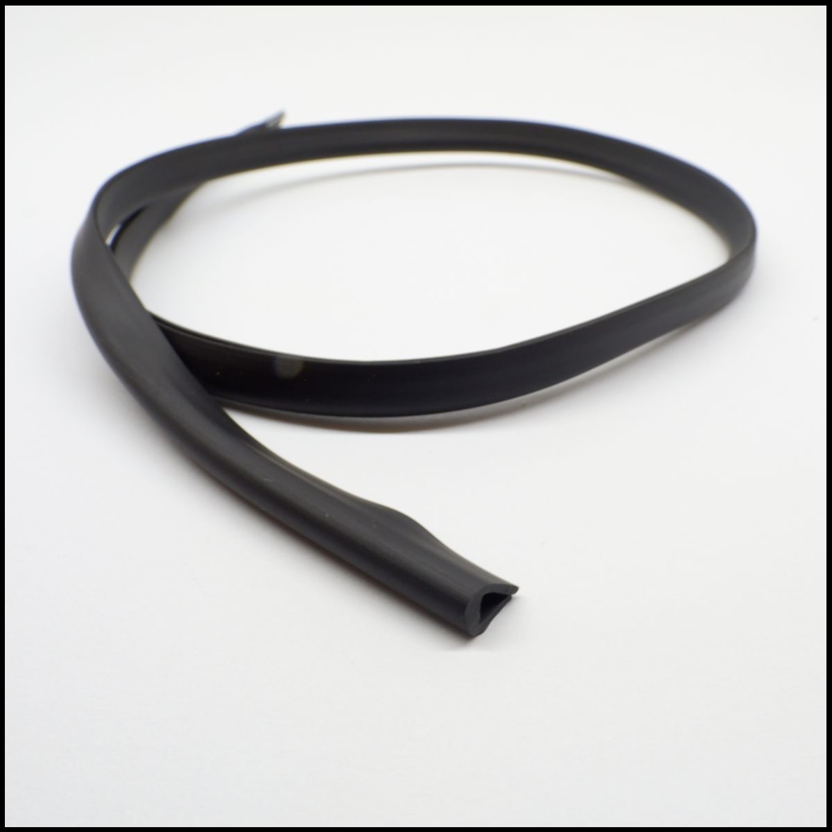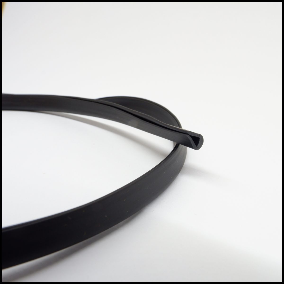 Perfil em borracha preto com textura lisa sobre fundo branco