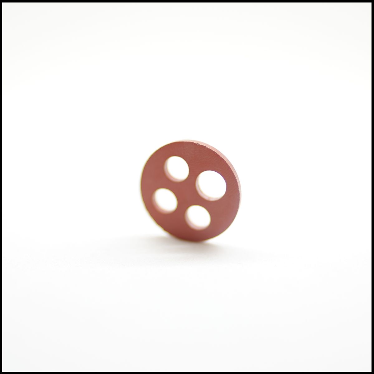 Botão redondo castanho com quatro furos em superfície branca
