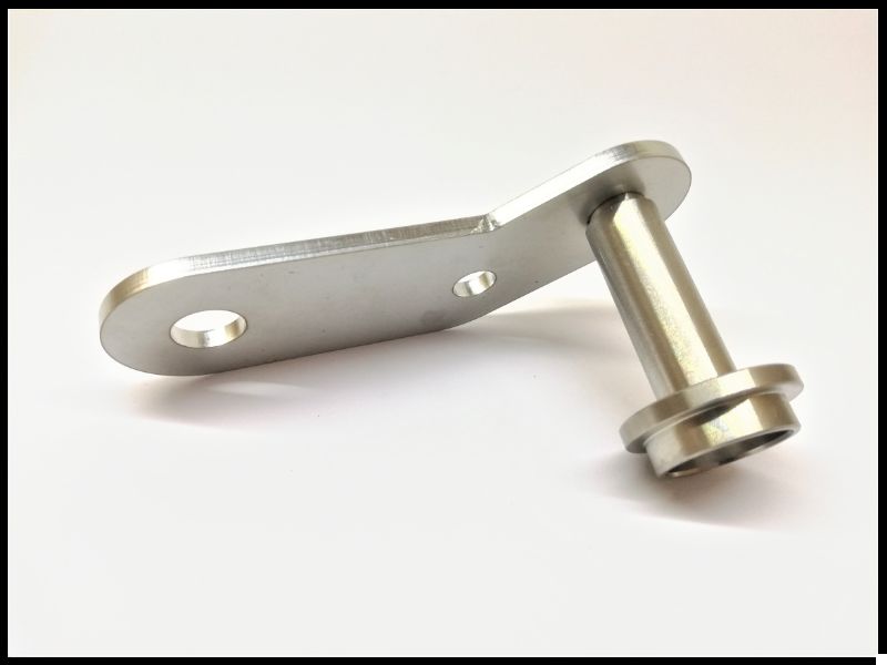 Peça metálica prateada com barra cilíndrica e placa plana com orifícios
