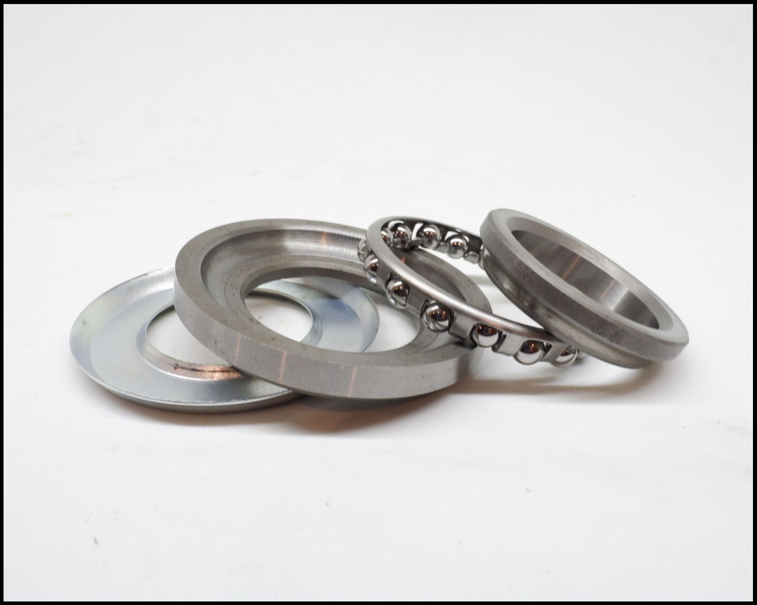 Peças metálicas incluindo anéis e rolamento esférico prateados sobre fundo branco
