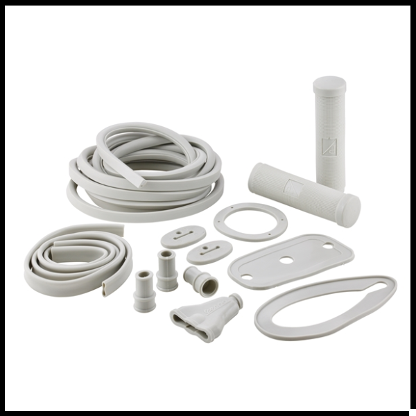 Peças em plástico branco, tubos e punhos texturizados num conjunto sobre fundo branco