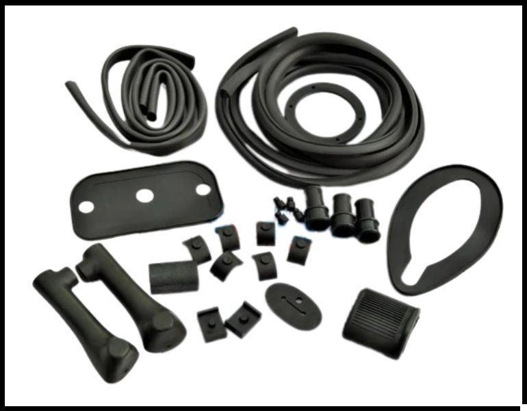 Conjunto de peças pretas de borracha variadas sobre fundo branco