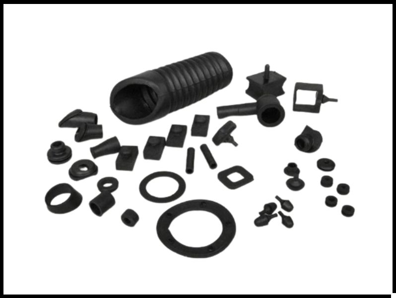 Pequenas peças de borracha preta variadas sobre fundo branco