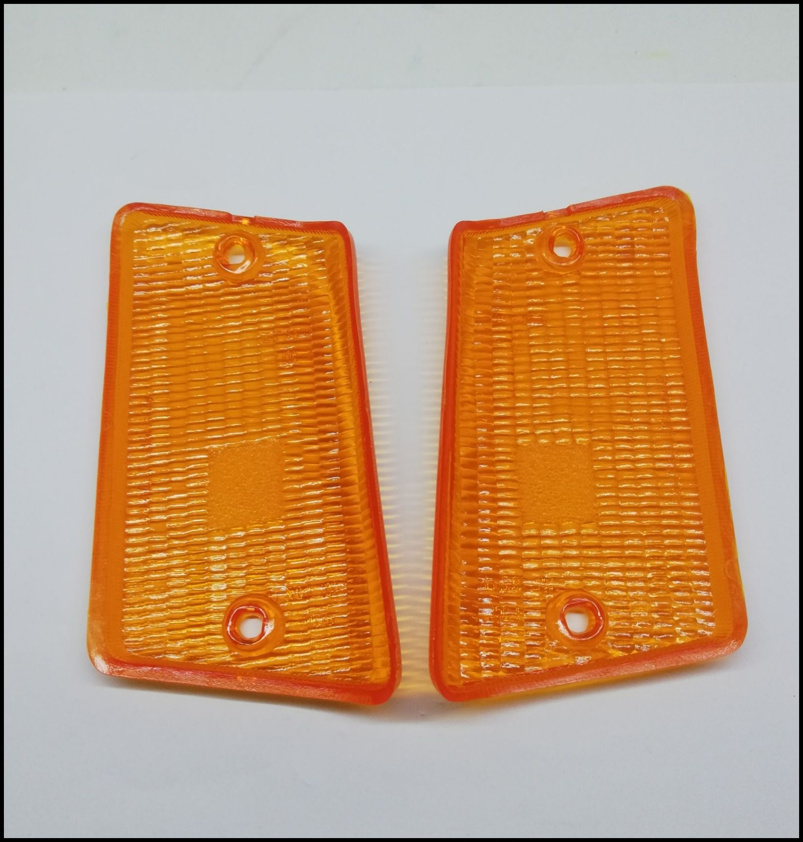 Par de lentes laranja para farolim dianteiro com textura quadriculada.