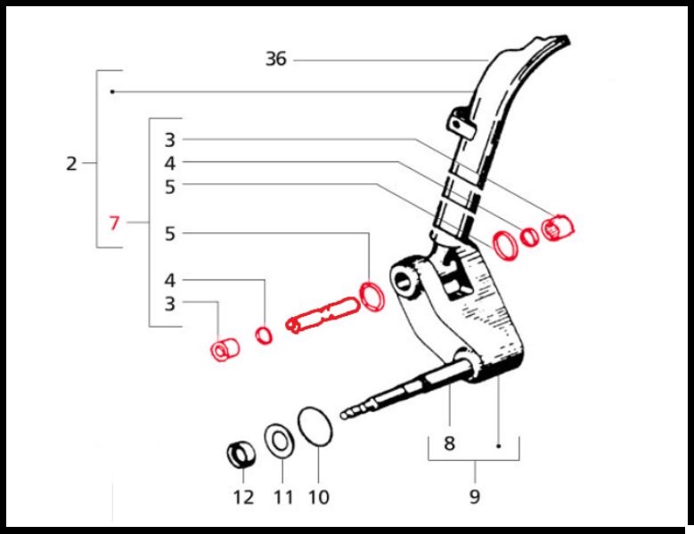 Desenho técnico de componente mecânico com partes numeradas e dimensão 36