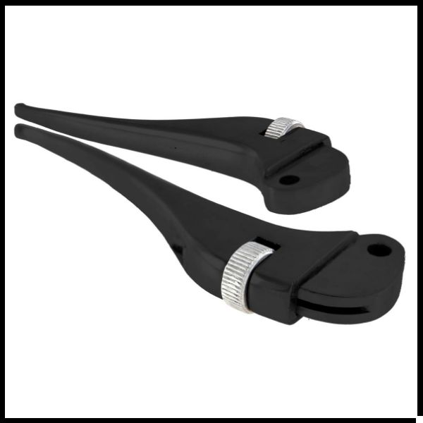 Duas pinças pretas com acabamento metálico prateado em fundo branco