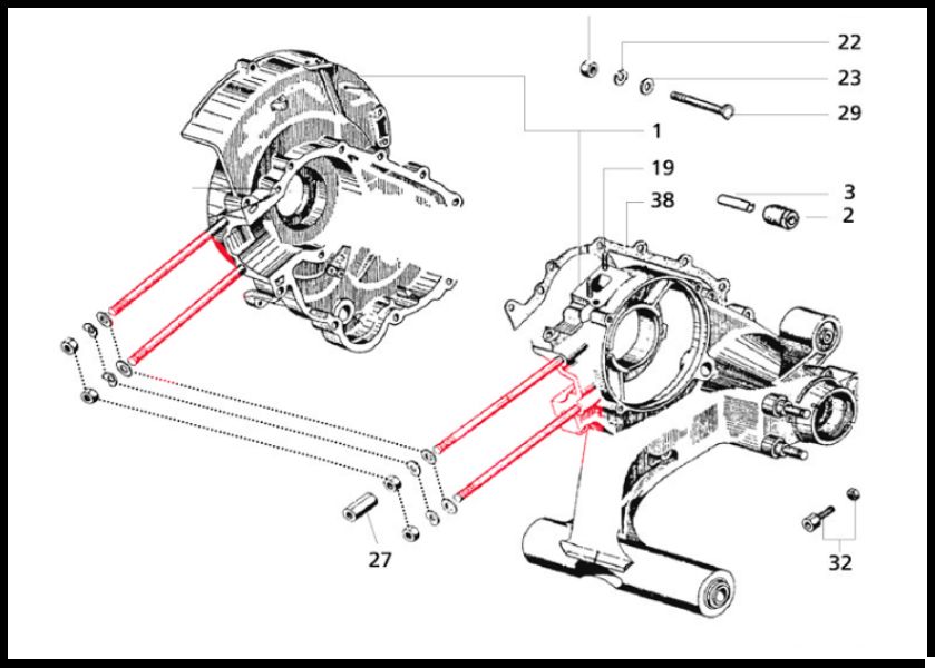 Desenho técnico de componentes mecânicos com linhas vermelhas de destaque e números de peças.