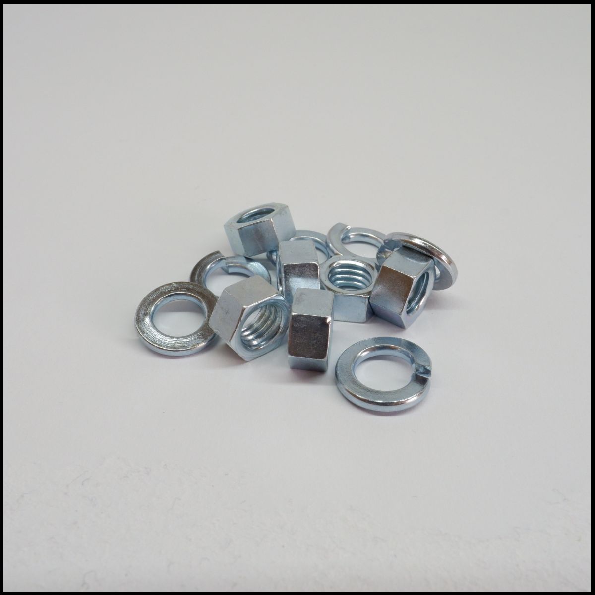 Porcas e anilhas metálicas prateadas sobre superfície branca