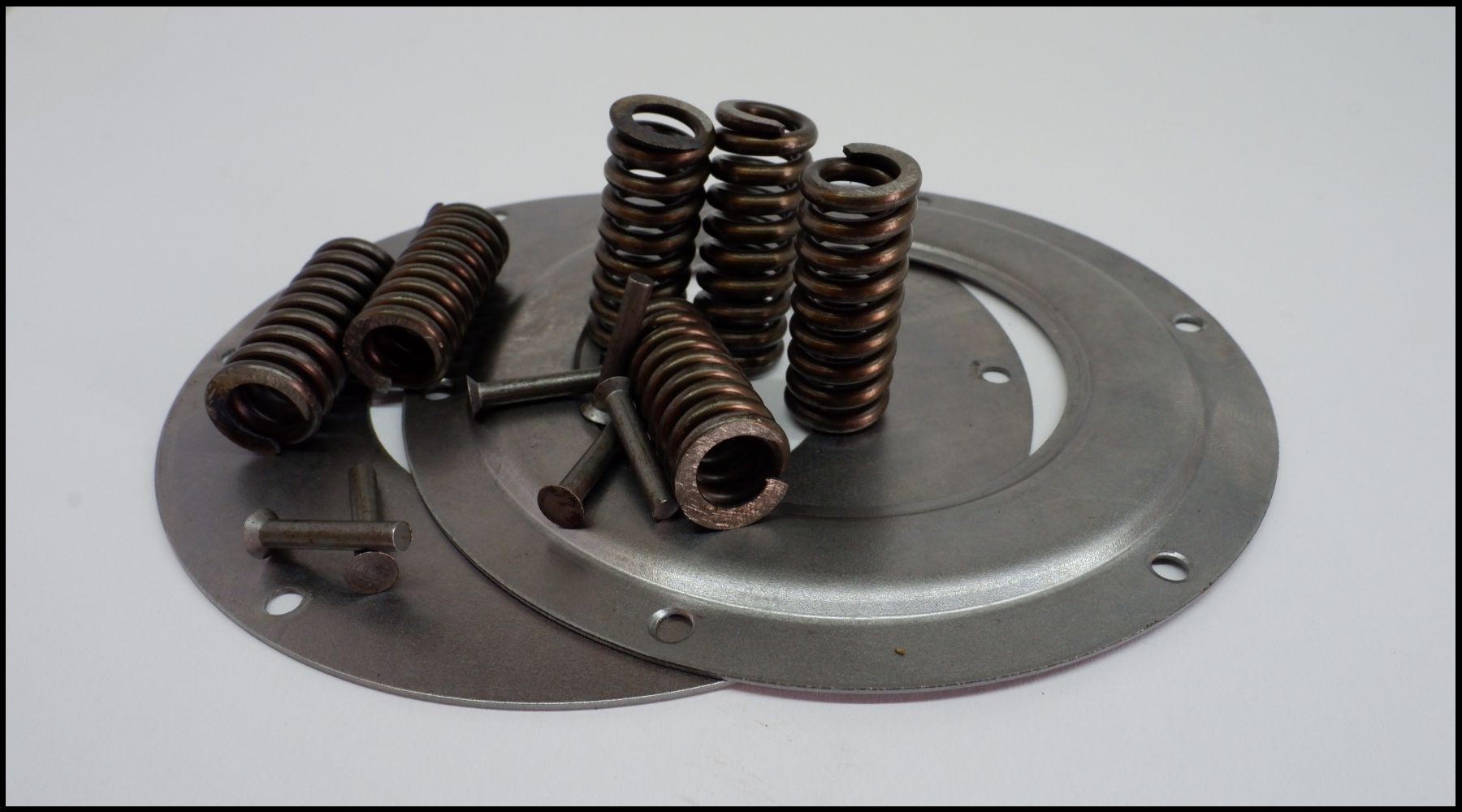 Peças metálicas compostas por molas, parafusos e chapas circulares cinzentas sobre fundo branco