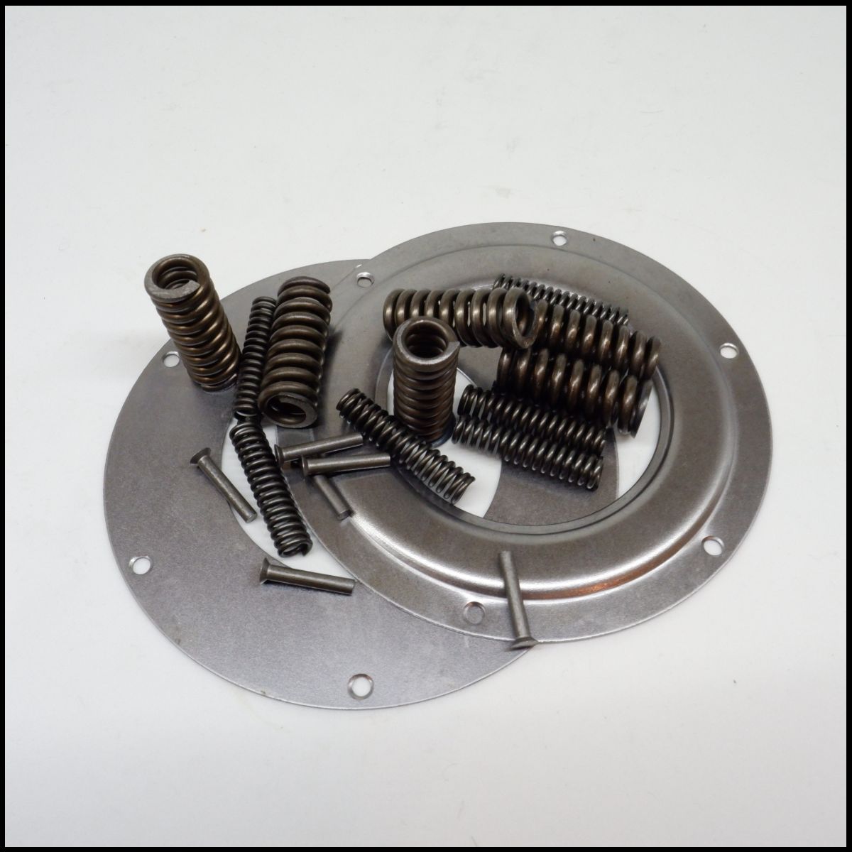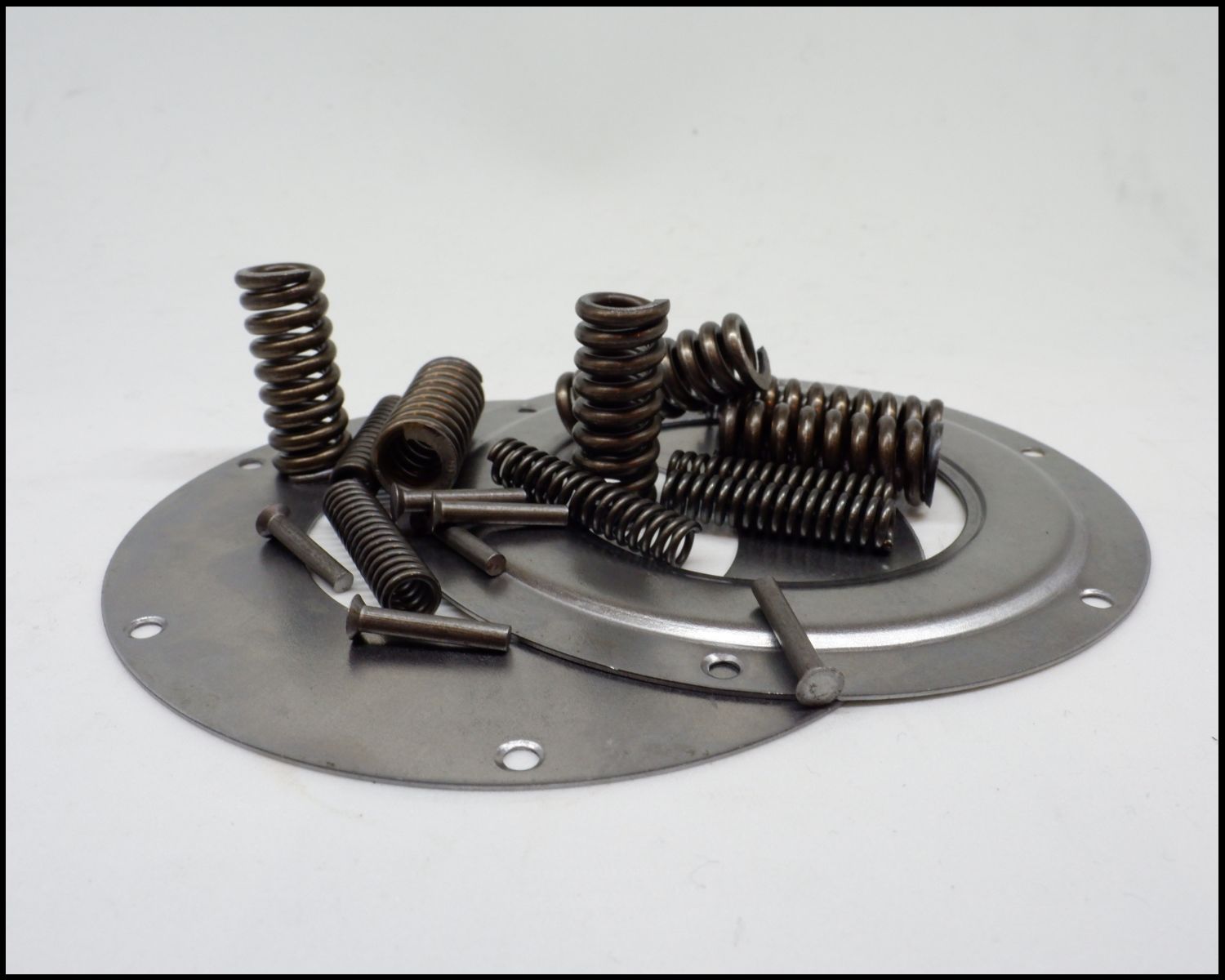 Placas metálicas circulares prateadas com molas e pinos sobre superfície branca