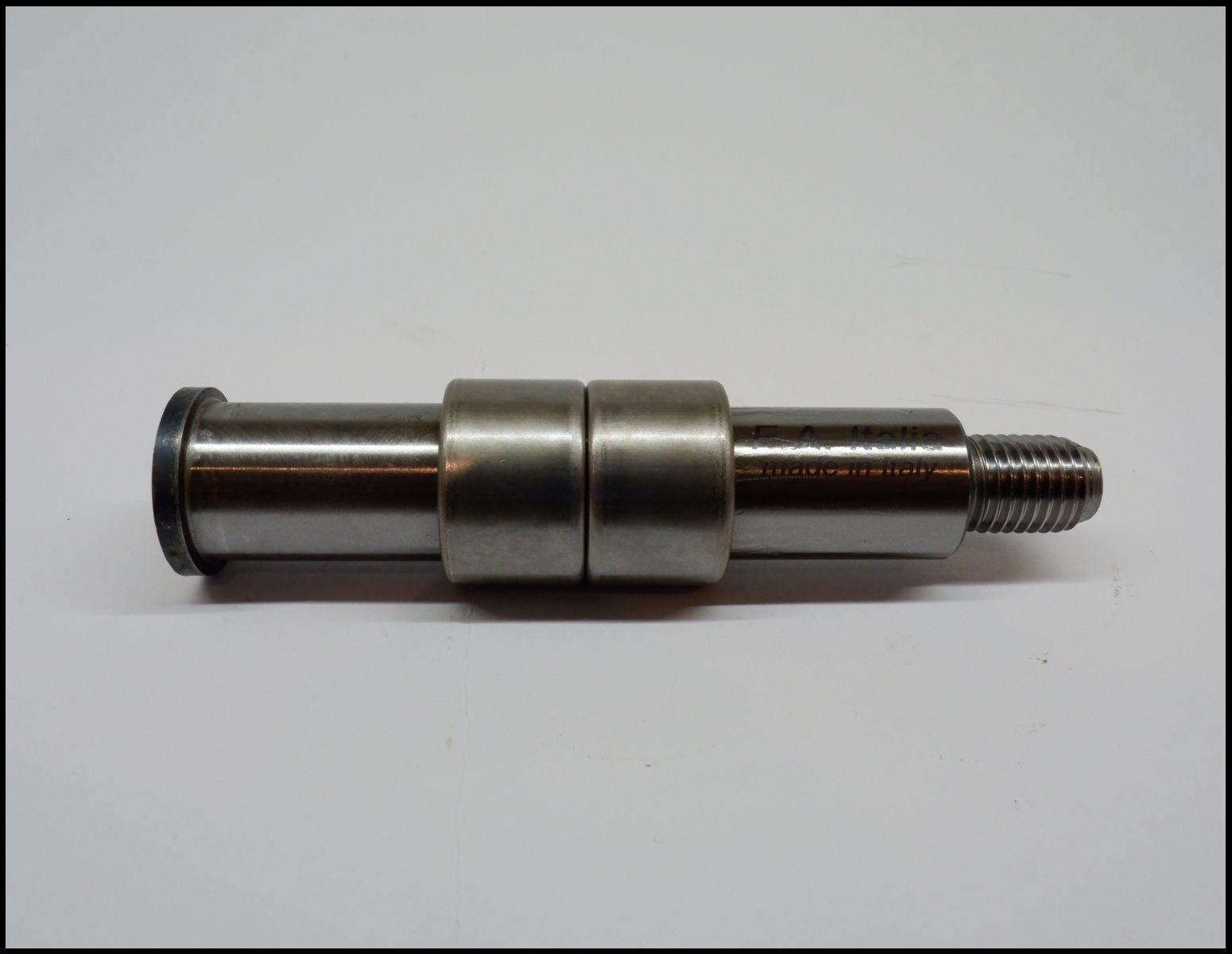 Eixo metálico cilíndrico prateado com rosca numa extremidade
