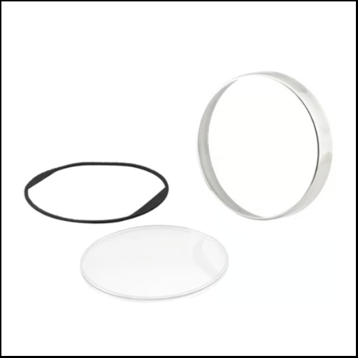 Componentes de relógio separados: pulseira preta, moldura metálica prateada e vidro redondo transparente