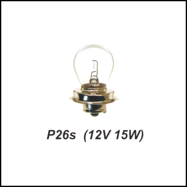Lâmpada automóvel P26s 12V 15W com base metálica e vidro transparente