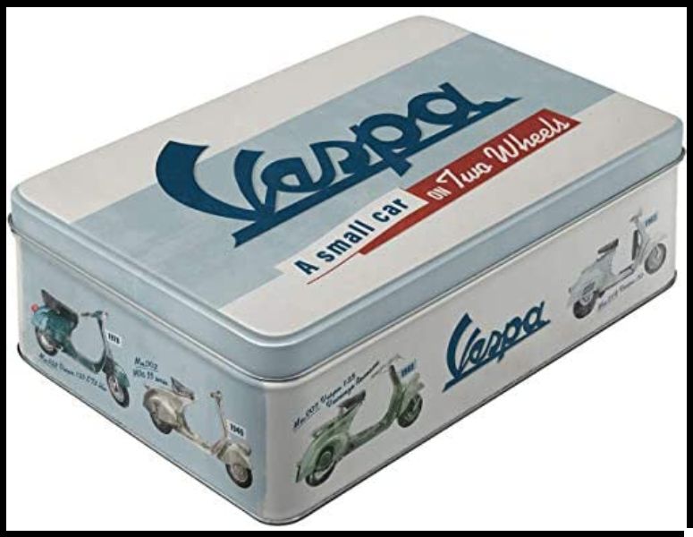 Caixa metálica retangular Vespa com ilustrações e texto em cinza e azul
