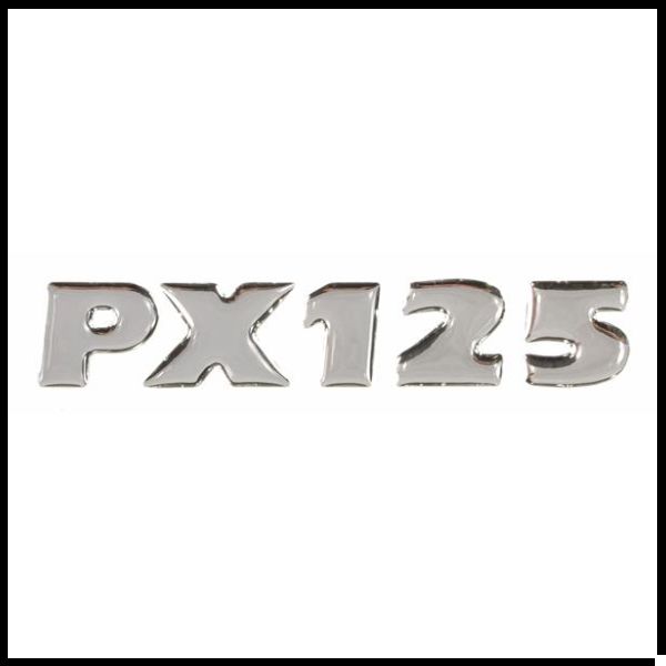 Emblema cromado PX125 em letras grandes sobre fundo branco.